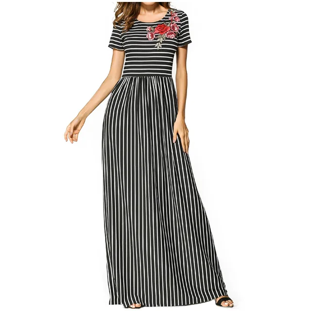 Fs Noir Femmes Maxi Robes Rayures Patchwork Robe Fleur Broderie Tunique Longue Robe Manches Courtes Moyen Orient Vetements Aliexpress