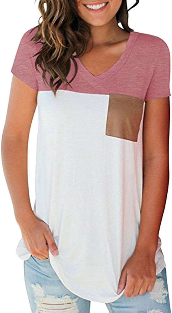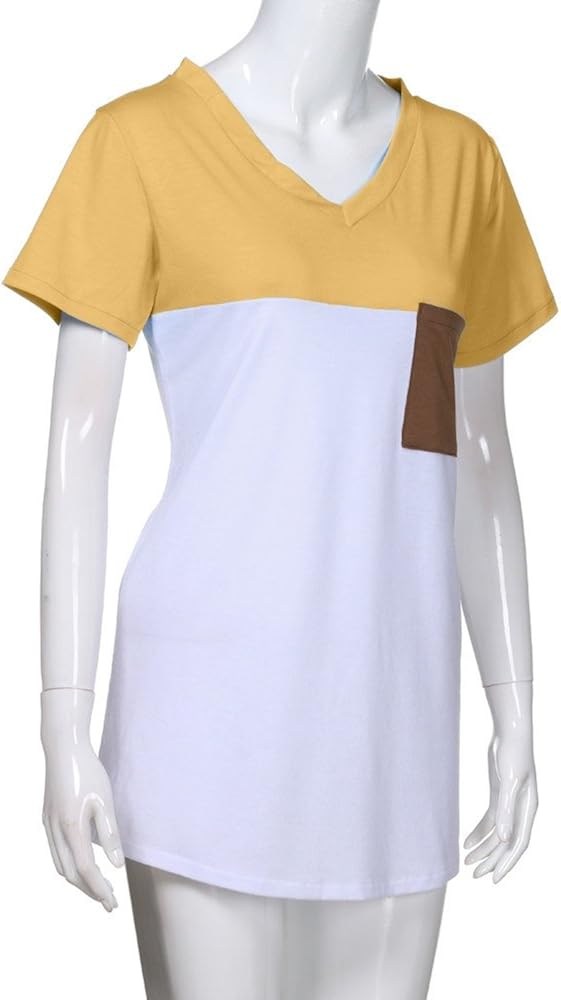 Siswong Tunique Longue Femme Grande Taille Chemisier Chic Femme Poche Col En V Manche Courte Ete Casual Mode Chemise Classique Haut Tops Blouse Epissage Des Couleurs Tee Shirt