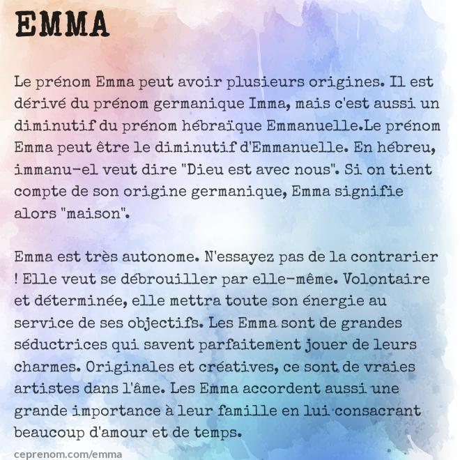 Le prénom Emma est très donné en France Voici donc tout ce qu'il faut savoir sur ses origines, sa personnalité ou encore sa signification. Pour certains parents, le plus important, en choisissant un prénom pour bébé, c'est l'originalité Ils ne veulent pas d'Emma, ni de Thomas!. Je suis naturelle , tu vois!.