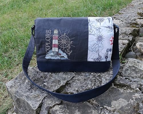 Grande Besace Brodee Pour Homme Ou Mixte Sac A Bandouliere En Toile Ciree Grise Coton Enduit Et Faux Cuir Bleu Marine Broderie Phare Amazon Fr Handmade