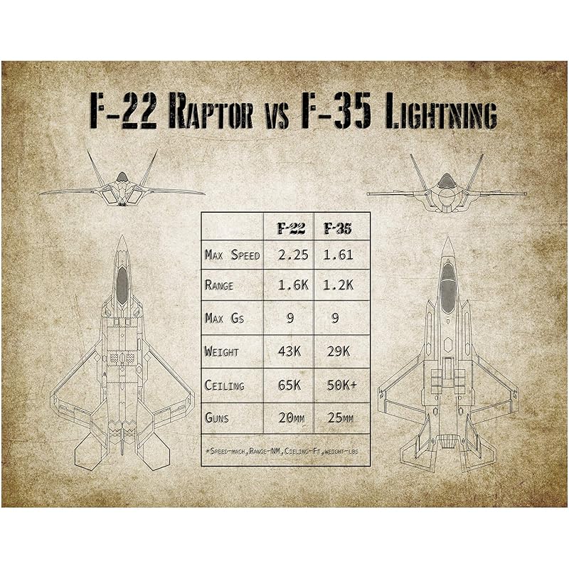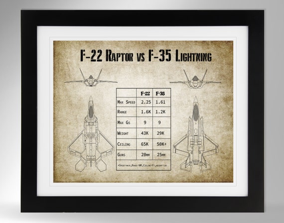 Amazon Com Lockheed Martin F 22 Raptor Vs F 35 Lightning Ii Stats Wall Art Print Usaf Not Framed Handmade
