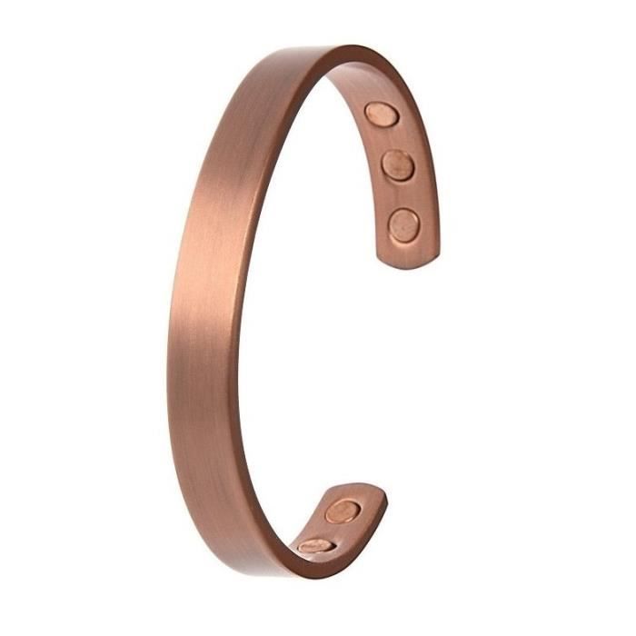 Bracelet magnétique en cuivre lisse avec aimants Pour votre bienêtre, portez un bracelet magnétique en pur cuivre avec aimants Choisissez le meilleur de la magnétothérapie bracelet en pur cuivre avec 6 aimants de 3000 Gauss haut de gamme dernière génération. En effet, le bracelet cuivre magnétique est issu de la combinaison de deux matières qui sont le cuivre et les aimants (comme son nom l’indique) Ces deux matières apportent beaucoup de bienfaits sur votre bienêtre en général et c’est pourquoi il remporte un franc succès. Le bracelet en cuivre et aimants associe l’élegance d’un bijou à l’efficacité antidouleur et antiinflammatoire du cuivre et des aimants Le cuivre est un oligoélément polyvalent, actif dans les états infectieux et inflammatoires Il stimule puissamment les défenses naturelles Le cuivre des bracelets, grâce à l’absorption par.