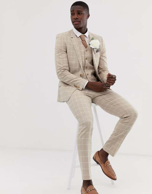 Asos Design Wedding Skinny Suit Jacket In Camel Linen Windowpane Check Asos