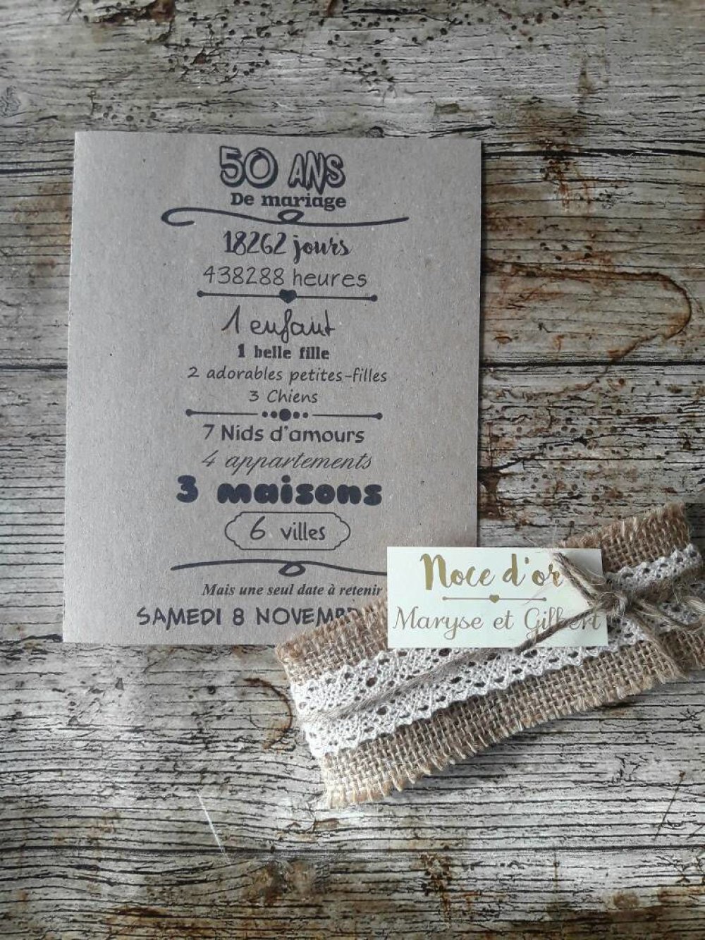 Home » faire part » Faire part 50 ans de mariage Faire part 50 ans de mariage Je veux voir les faire part de mariage à bas prix et accessoires déco ICI Faire part 50 ans de mariage. 50 ans de vie commune, c’est 50 ans de souvenirs En voilà une chouette idée pour un anniversaire de mariage ensemble, repassezvous le film de votre vie à deux et sortez les albums photo des armoires Consacrezy un aprèsmidi et rappelezvous les moments les plus beaux, les plus difficiles, les plus drôles, les plus tristes et les. Pour chaque anniversaire de mariage, la tradition veut que l'on offre à sa moitié un cadeau en rapport avec la matière des noces fêtées Pour les 50 ans de mariage, les bijoux en or.