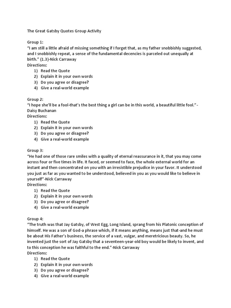 The Great Gatsby Quotes Group Activity The Great Gatsby