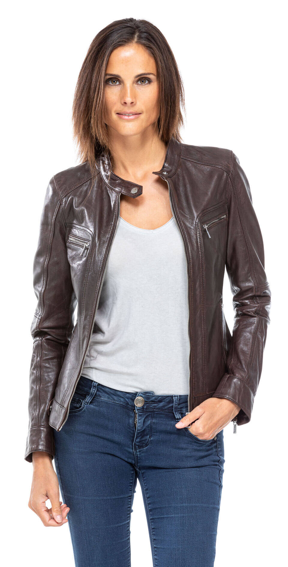 Blouson En Cuir Marron Pour Femme Avec Col Mao