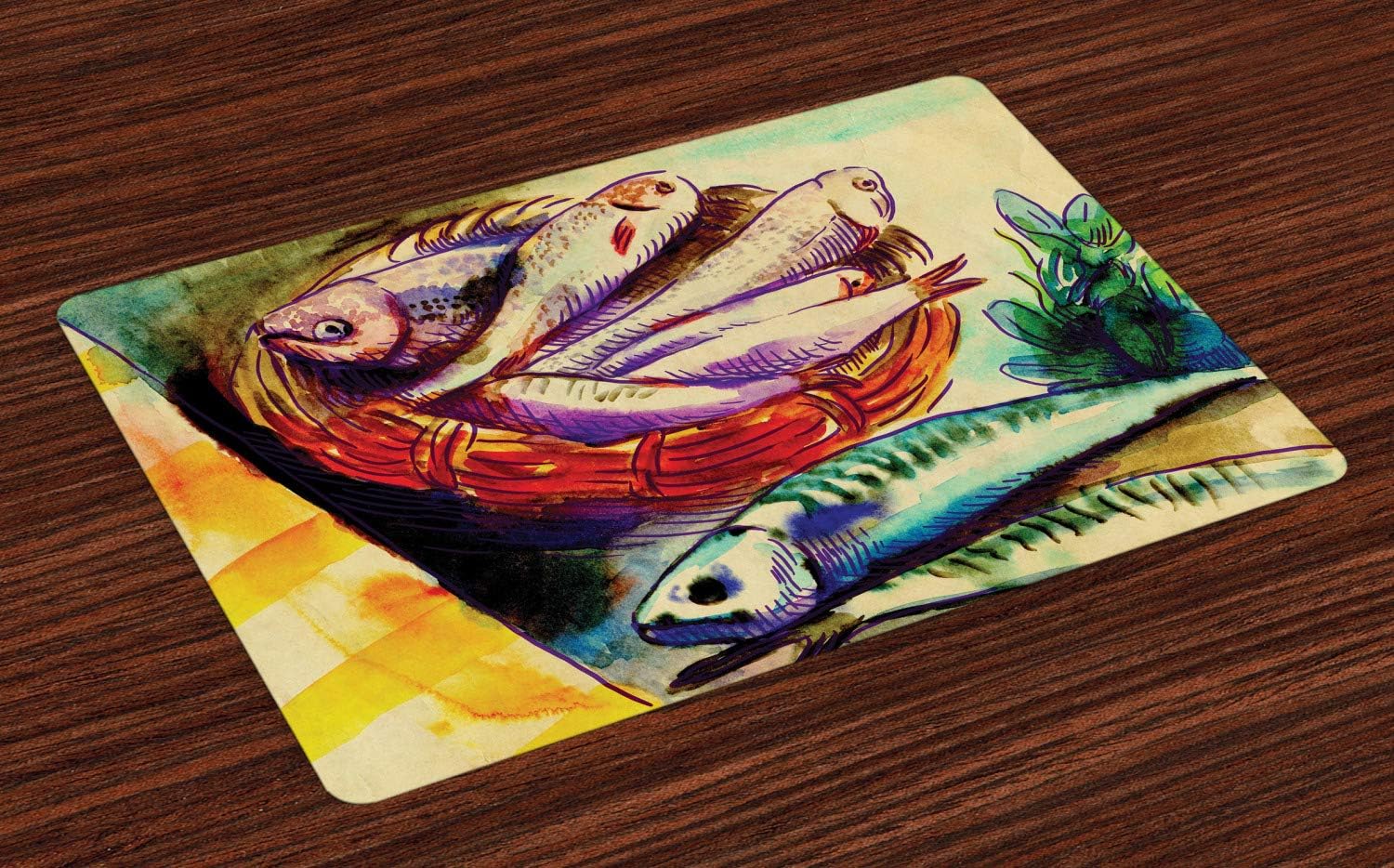 Amazon Com Lunarable Fine Art Place Mats Set Of 4 Hand Drawn Fish In A Basket Old School Historical Layout Healthy Food Washable Fabric Placemats For Dining Table Standard Size Multicolor Home