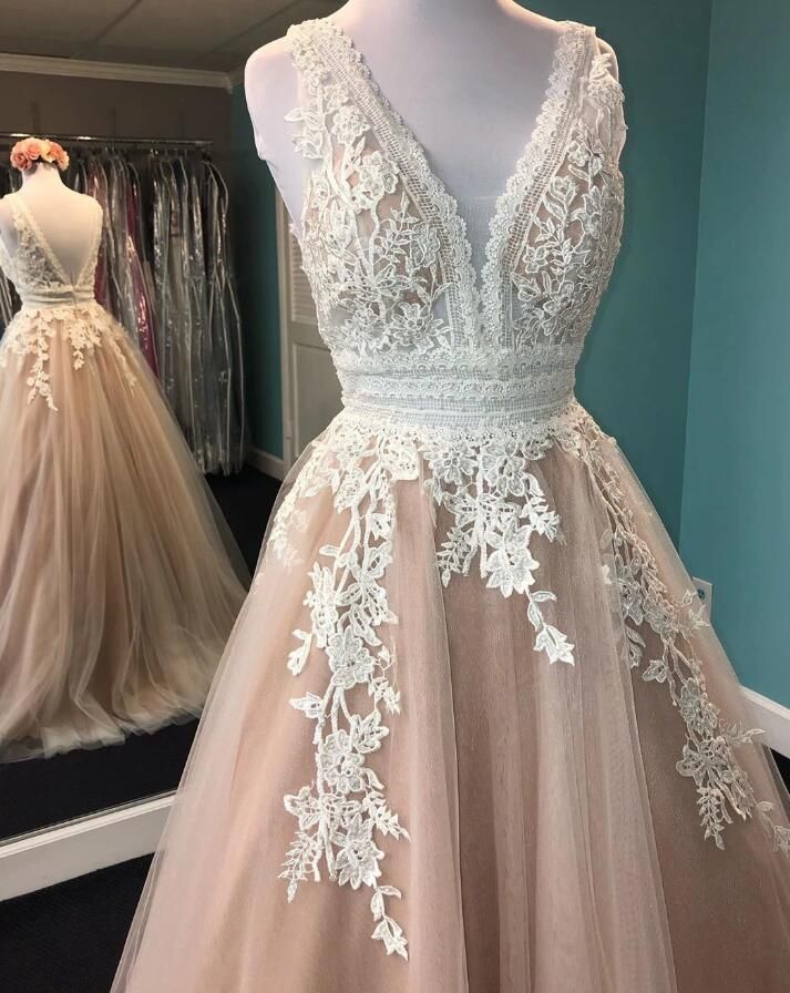 Acheter Une Ligne Champagne Robes De Bal 21 V Coula Col Dentelle Robes De Soiree Officielles V Back Open Plancher Longueur Longueur De Mariee Engagee Porter Chic Vintage Style De 79 16