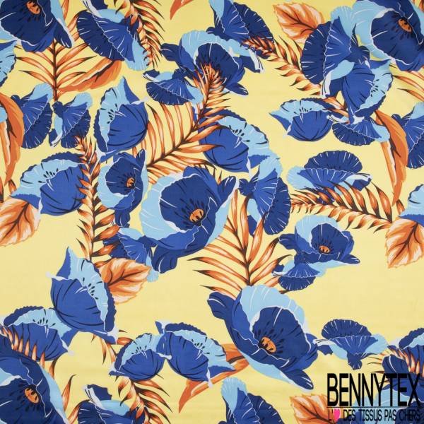 Satin De Coton De Soie Imprime Floral Tropical Ton Bleu Jaune Rouge Bennytex Vente De Tissus Pas Cher Au Metre
