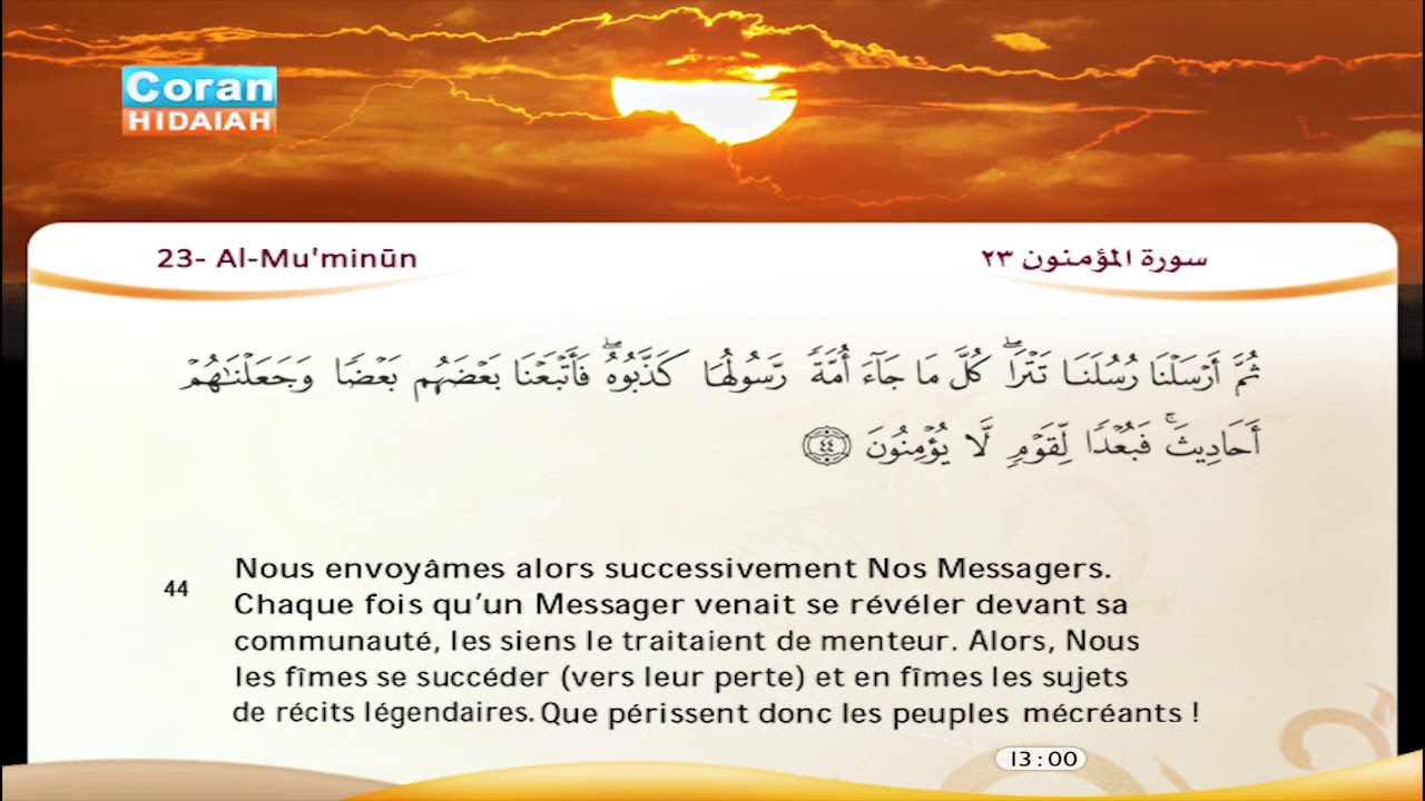"émotions, rappel" sourate 23 Al Muminun verset 97 à 114 Mosquée de Gennevilliers May 21, 19 · passage Coran émotion soustitré Français sourate 23 verset 97 à 114 Related Videos 908 Sourate ArRahman (Le Miséricordieux) Soustitrée Sheikh Nabil Mosquée de Gennevilliers. Cette sourate doit son nom "almu’minûn" c’està dire "les croyants" à son premier verset. Les bienfaits de la lecture de la sourate Al Mu’minun Afin de profiter des innombrables vertus de la sourate Al Mu’minun, il est recommandé de la lire à tous moments surtout le vendrediEn effet, quiconque persévère dans la lecture de cette sourate Dieu lui accordera dans ce bas monde la joie et le bonheur, et dans l’au delà, il lui accordera l’honneur de faire partie de ceux qui.