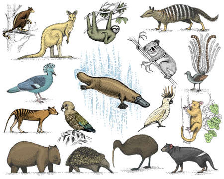 Premium Vector Big Set Of Australian And New Zealand Symbols Animal Engraved Hand Drawn Vintage Drawing Tasmanian Wolf Kea Parrot Possum Duck Billed Platypus Devil Numbat Wombat Koala Kiwi Bird