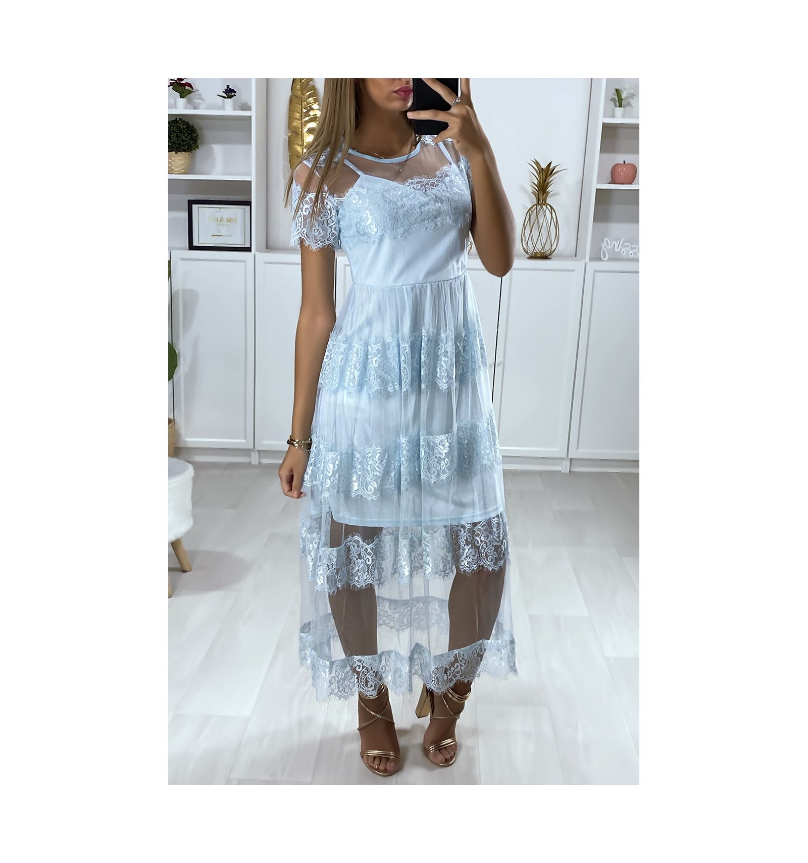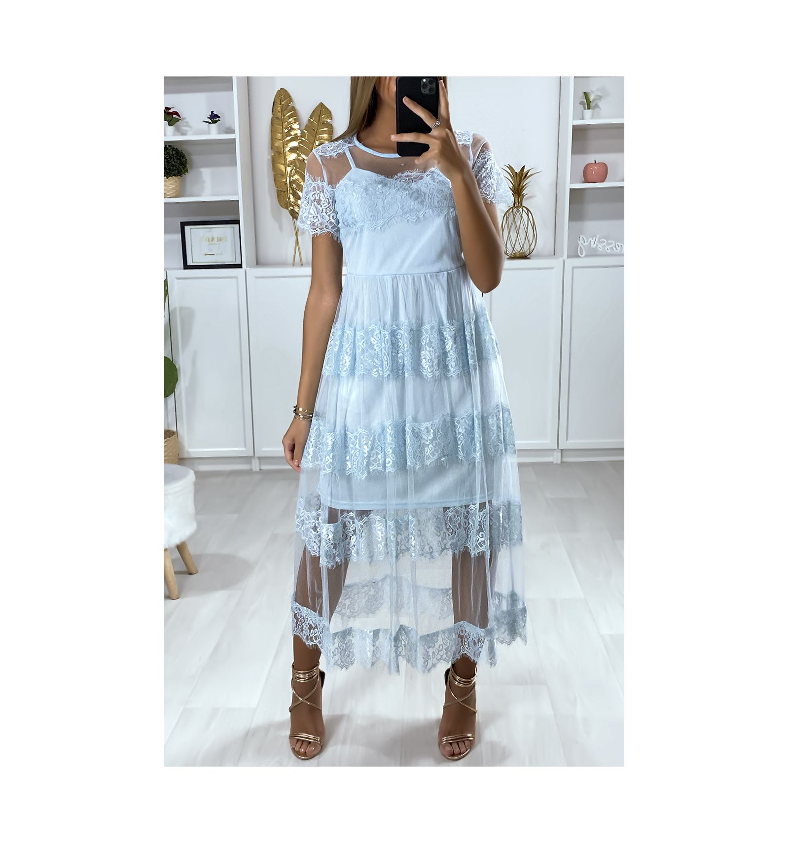 Long Blue Dress In Veil Lined With Lace