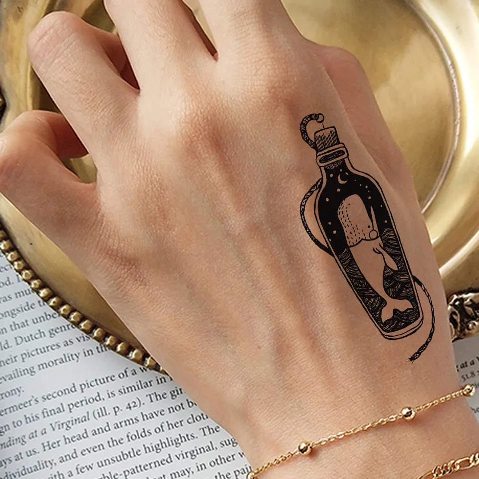 Vankirs Bouteille Baleine Petit Tatouage Temporaire Autocollants Femmes Corps Bras Poitrine Noir Faux Tatoos Hommes Etoiles Lune Dauphin Pate De Tatouage Aliexpress
