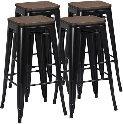 Kosmi Lot De 4 Tabourets De Bar En Metal Noir Mat Et Assise En Bois Fonce Avec Dossier Chaise De Bar Tabouret Metal Et Bois Haut Hauteur 76cm Parfait Pour Table