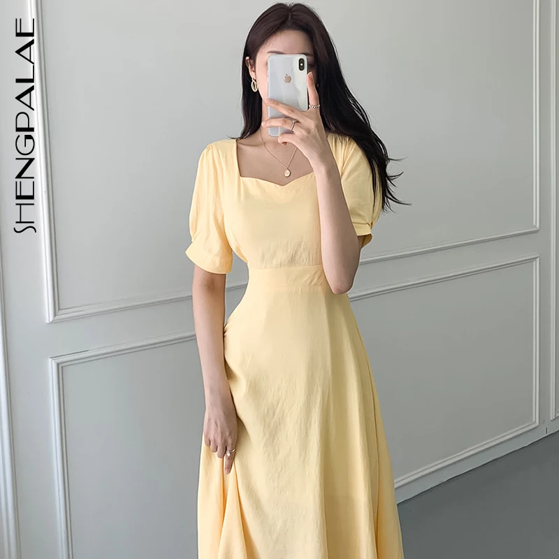 Shengpalae Robe Longue Elegante Avec Nœud Papillon A Manches Courtes Avec Col Carre Taille Slim Manches Courtes Jaune Qv1000 Ete Aliexpress