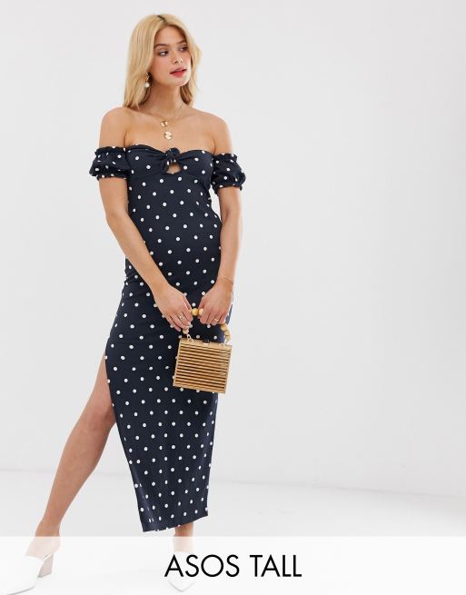 Asos Design Tall Robe Longue D Ete Effet Froisse A Epaules Denudees Avec Manches Bouffantes Et Motif Pois Asos