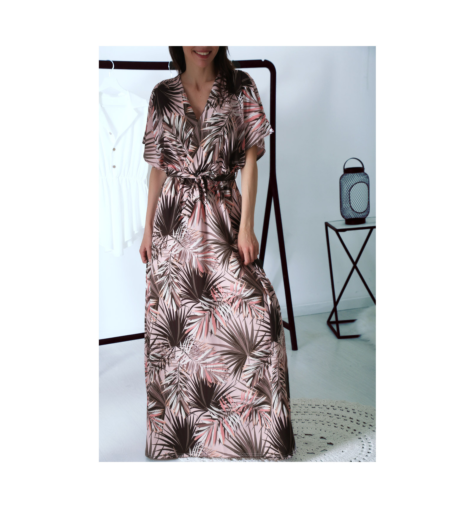 Robe Longue D Ete Fleurie A Dominance Rose Croise Au Buste Avec Ceinture