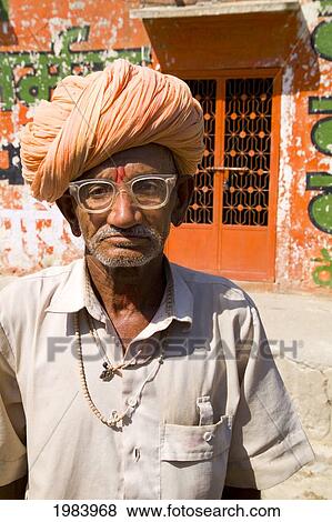 Inde Rajasthan Jodhpur Portrait De A Hindou Homme Portant Lunettes Et Turban Banque De Photo Fotosearch