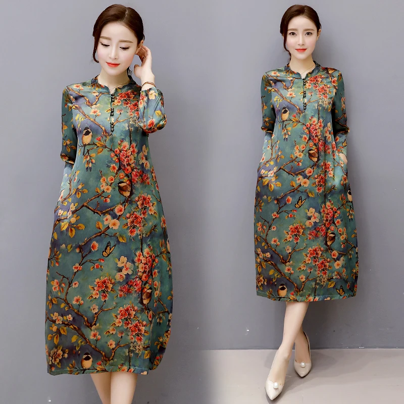 Vintage Print Silk Dress Vetement Femme 19 Spring Style Luxury Ethnic Office Wear Long Dress For Women Robe Party Dress Hj128 Dresses Aliexpress