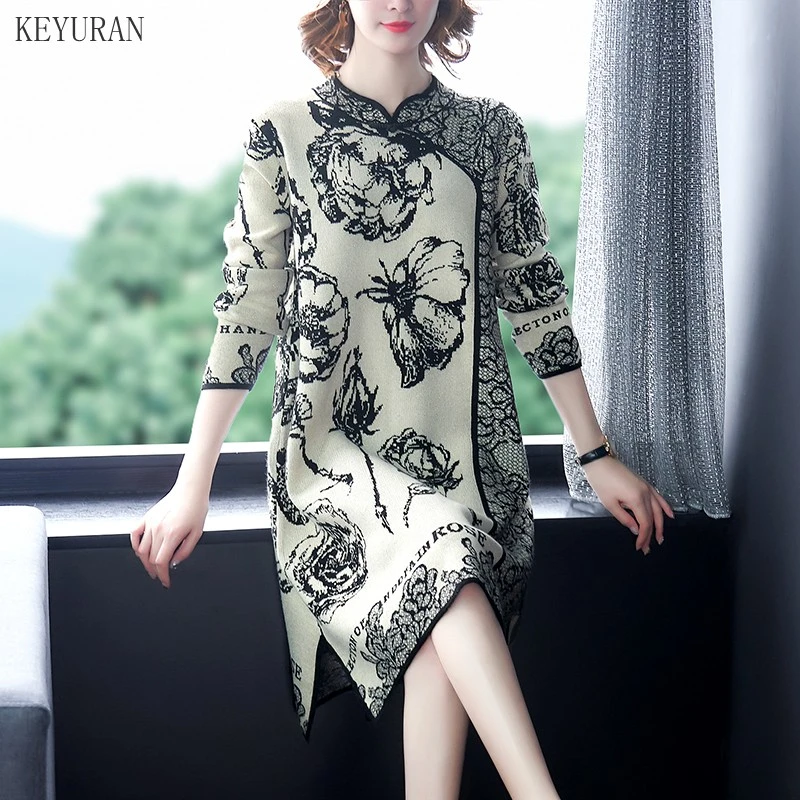 Large Size Keep Warm Vintage Dress Women Cheongsam Style Print Knitted Dresses Women Sweater Dresses Elegant Vetement Femme Dresses Aliexpress