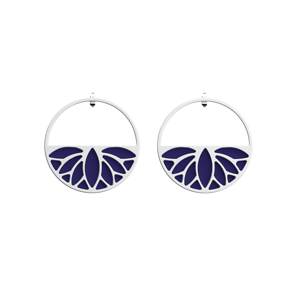 Boucles D Oreilles Creoles Lotus Finition Argentee Indigo Blanc Casse