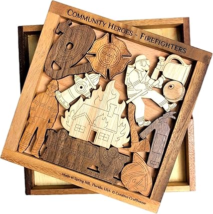 Amazon Com Community Heroes Firefighters 12 Pc Wood Brain Teaser Puzzle With Cover Toys Games