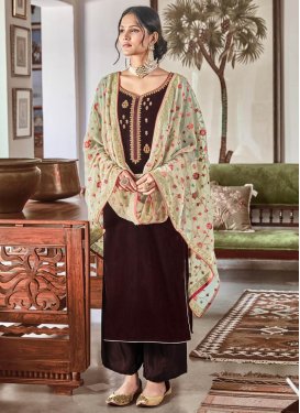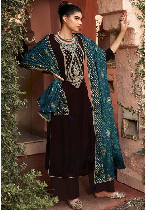 Brown Velvet Embroidered Party Wear Palazzo Suit Salwar Kameez Designer Collection