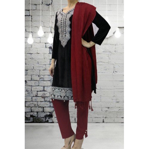 Idc 409 Black Velvet Winter Salwar Kameez With Matching Winter Shawl