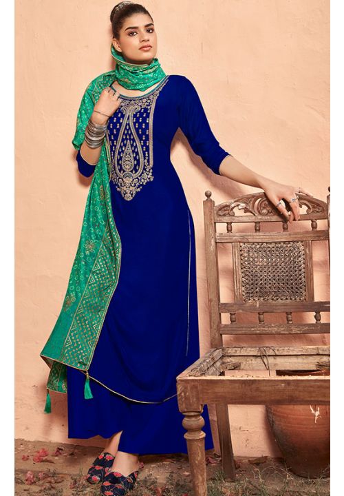 Blue Velvet Embroidered Party Wear Palazzo Suit Salwar Kameez Designer Collection