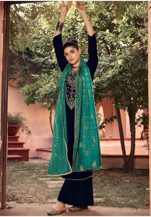 Navy Blue Velvet Embroidered Party Wear Palazzo Suit Salwar Kameez Designer Collection