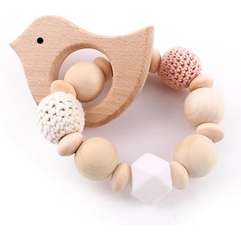 Bracelet Hochet De Dentition Perles Bois Et Silicone Anneau Forme Oiseau