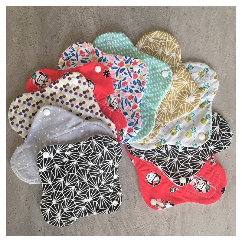 Le second, en tissu absorbant, est cousu pardessus le premier, et a la forme d’un protègeslip sans rabats Votre patron comportera donc 2 pièces l’une en forme de serviette hygiénique avec rabats, à découper dans 2 tissus différents ;. La flanelle C’est le tissu qui sera en contact avec votre peau La flanelle est un coton gratté, d’une douceur incomparable, épais et absorbant Le tissu éponge (Facultatif pour la taille T1 Protègeslip) Composé de petites bouclettes, épais, moelleux, il aura pour rôle d’absorber les flux Il se trouve inséré entre la. 2 serviettes hygiéniques, dessus en ratine de coton biologique;.