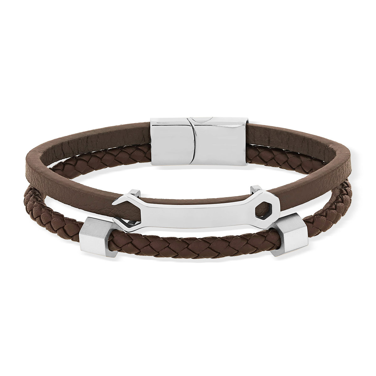 Bracelet Cuir Tresse Acier Inoxydable Pour Homme Marron