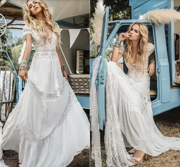 Vintage Crochet Dentelle Boheme Plage Robes De Mariee 21 Manches Courtes Col En V Fluide Flare Ete Vacances Robe De Mariee Vestidos Leather Bag