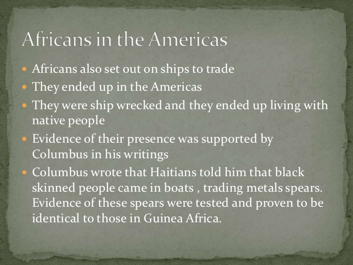 Did African people come to the Americas (North, South, and Central America) before Columbus’sarrival in 1492?. The transportation of plants, animals, and textiles between the continents;. No_Favorite share flag Flag this item for.