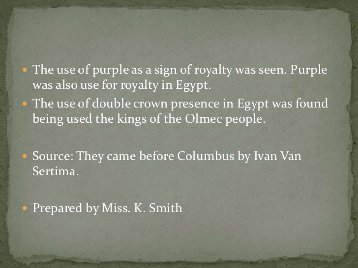 And the diaries, journals, and oral accounts of the explorers. The transportation of plants, animals, and textiles between the continents;. In his book, "They Came Before Columbus," Van Sertima, a Rutgers professor, says that African influences can be found in an array of cultural similarities between Africa and the ancient Americas.