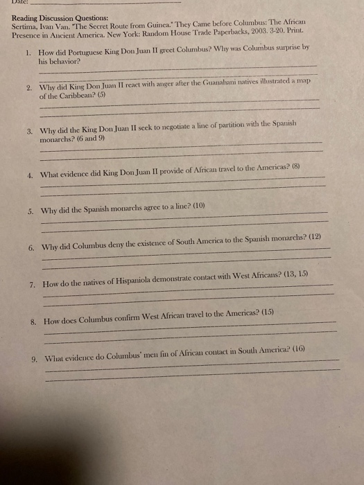 Reading Discussion Questions Sertima Ivan Van T Chegg Com