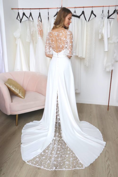 ROBE DE MARIEE D'ESSAYAGE La robe de mariée 51 de Céline de Monicault est une robe de mariée audacieuse Le top a manches longues est en tulle brodé qui joue avec la transparence Alors que la jupe est en crêpe de chine ce qui lui donne ce côté si vaporeuxTulle brodé Crêpe de chine Cintrée à la taille Décolleté en V dans le dos. Collection robes 18 Trouvez LA robe qui vous sublimera !. Robe de mariée Longue à petit prix !.