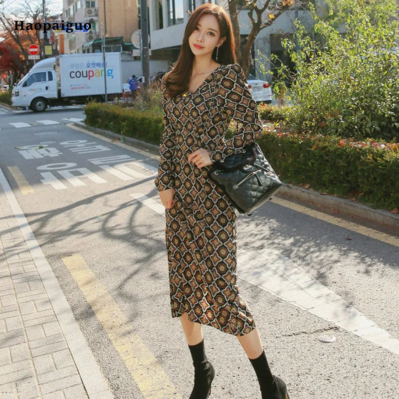 Robe Droite Imprimee De Grande Taille Pour Femmes A Manches Longues Col En V Longueur Mi Mollet Style Boho Tenue Folklorique Vintage 18 Aliexpress