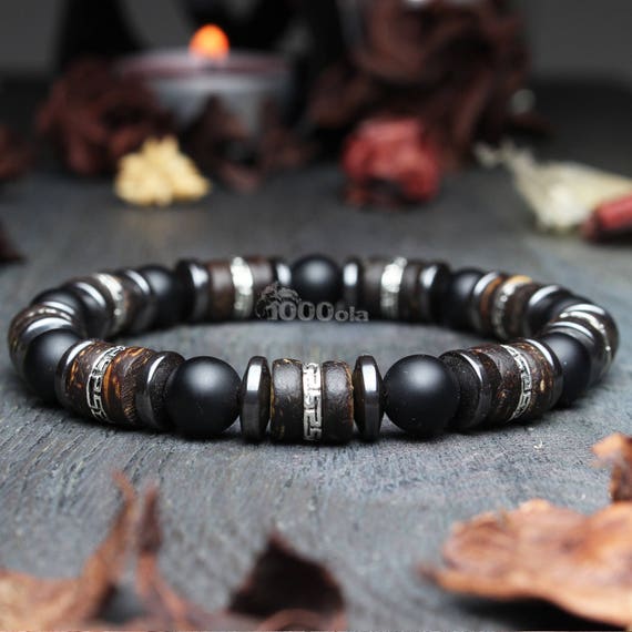 High End Bracelet Men Woman Pearls 8mm Pierre Agate Black Mat Wood Coconut Hematite Steel Inoxidable Appearance Antique Tibetan Style