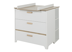 Le charme et la solidité Cette commode à langer se présente sous la forme d’une commode moderne au design contemporain qui permet de changer bébé dans sa chambre tout en ayant à portée de main tout le nécessaire de change E. Commode 3 tiroirs Plan à langer amovible pour une utilisation en commode simple Stucture et facades tiroirs en panneau de particules agglomérées mélaminé Poignées tiroir en panneau de fibres haute densité Protection latérales du plan à langer en hêtre Dimensions 79 x 54 x 85 cm. Plan à langer à poser sur la commode à langer ou sur le lit de bébé grâce à son kit de fixation;.