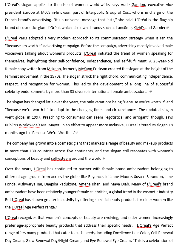 Because you’re worth it “你值得拥有”– ask anybody in the streets of China and they will recognize L’Oréal’s memorable brand tagline However, scratch the surface further, few would have known that the cosmetics beauty giant L’Oréal Group also owns 16 other brands in China since first entering in the market in 1996 China Looks Beautiful to L'Oréal If you compare L. With its slogan “because you’re worth it,” L’Oréal has caught on to a crucial aspect of personhood Selfworth that shapes how we treat ourselves and others, and a majority of the young girls and women that seek pregnancy help don’t have the understanding that they are “worth it” Everyone wants to know they are worth it. Feb 05, For example, the tagline by haircare brand L’Oréal Paris, “Because you’re worth it,” gives you an uplifting feeling about the product—whereas a 15 slogan by Dr Pepper, “It’s not for women,” is intentionally divisive and uses a slightly negative tone.