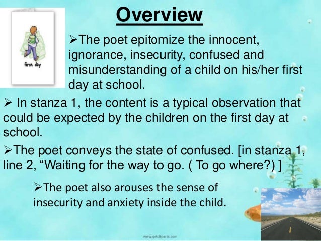 His unknowing mind of the perplexing new world and how that has aroused a sense of anxiety and insecurity inside him. Here is my 'first day of school poem' for you to read and share with parents of other children about to start school Is your child starting school soon?. The first day of school is a day of major anxiety for the kid as well as the parents The kid is surrounded by a lot of questions how he/she looks, whether he/she will make good friends there at school, how the teacher will be, etc In this Class 2 poem “First Day at School”, the poet Aileen Fisher has brought out the same emotions The.