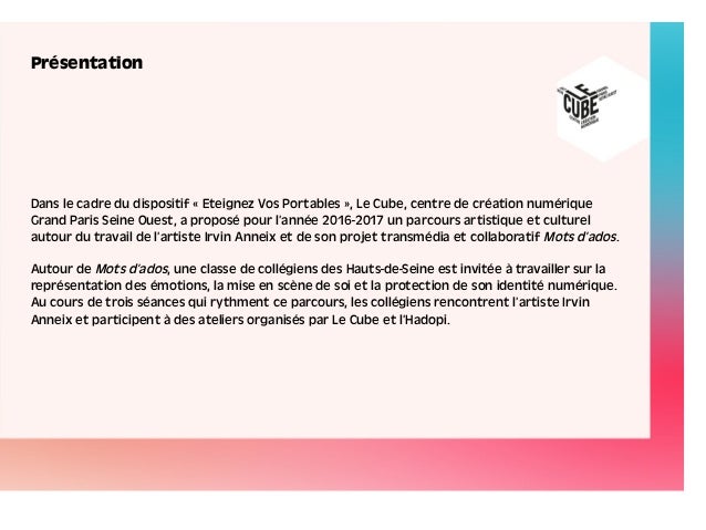Le courtmétrage / Bandeannonce de Mots d'ados, un projet artistique collaboratif d'Irvin Anneix sur les écrits intimes de l'adolescence Vidéo diffusée lors des 5 ans du Studio 13/16 au Centre Pompidou, le 12 septembre 15. Utilisez ces exemples comme base, et n’hésitez pas à les adapter avec vos propres mots. Mots d’ados est un projet collaboratif sur les écrits intimes de l’adolescence En deux ans, Irvin Anneix a constitué une collection de plus de 5000 écrits, manuscrits comme virtuels, qu'il fait lire par d'autres adolescents qui en deviennent la voix.