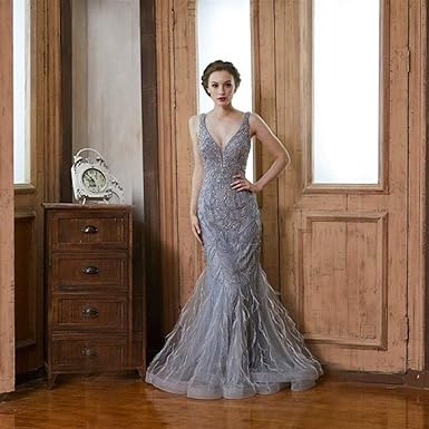 Lijincheng Robe De Soiree Luxe Gris Sirene Robe De Soiree Sexy Col En V Backless Perles Plumes Dentelle Longueur De Plancher Taille Longue Robe De Soiree Plus Amazon Fr Vetements Et Accessoires