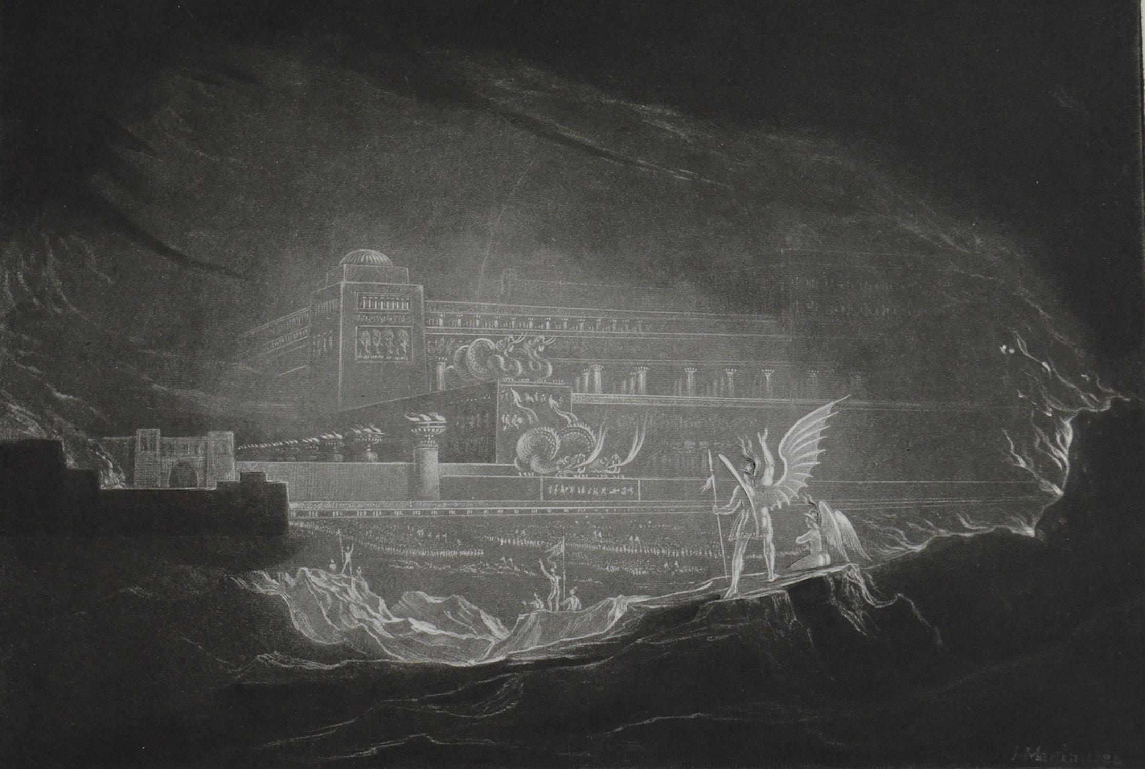 John Martin, Pandemonium, Mezzotint, 17 $400 Asking Price About Wonderful mezzotint by John Martin from John Milton's Paradise Lost Published by Septimus Prowett, 17 Unframed Full margins On good quality wove paper We can frame the print for you if you require Details. "Pandemonium" (15) by John Martin Inspired by John Milton's "Paradise Lost," this painting depicts a demonic palace in hell. John Martin, Pandemonium, 1841, oil on canvas, 123 x 184 cm (Private Collection) The Thames itself, the source of London’s water supply, also caused the deaths of hundreds every week from cholera during periods of epidemic Something had to done and in the late 10s Martin took it upon himself to do it, submitting a proposal to parliament.