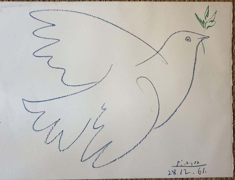 La colombe de la paix picasso. Cookies Vous pouvez définir vos préférences en matière de cookies en utilisant les boutons cidessous Vous pouvez mettre à jour vos préférences, retirer votre consentement à tout moment, et voir une description détaillée des types de cookies que nos partenaires et nousmêmes utilisons dans notre Politique en matière de cookies. Pablo Picasso () (after) La Colombe de la Paix Chromolithography Signed in the plate On Velin d’Arches paper 38 x 56 cm Authenticated by the artist’s blind stamp on the bottom right (see picture) Art et Paix Editions / Picasso Estate In excellent condition Carefully packaged international parcel. La Colombe de la paix est un dessin sur affiche de Pablo Picasso réalisé en 1949 Après la Seconde Guerre mondiale (1939/1945) ayant fait tant de morts, tant de ravages et tant d'horreurs ;.