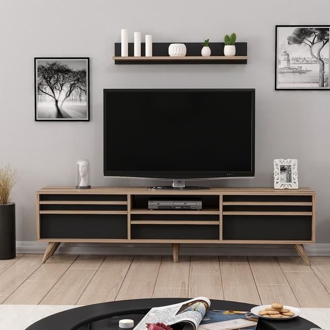Homemania Meuble Tv Hira Moderne Avec Portes Etageres Pour Salon Noyer Noir En Bois 180 X 35 X 48 Cm Rakuten