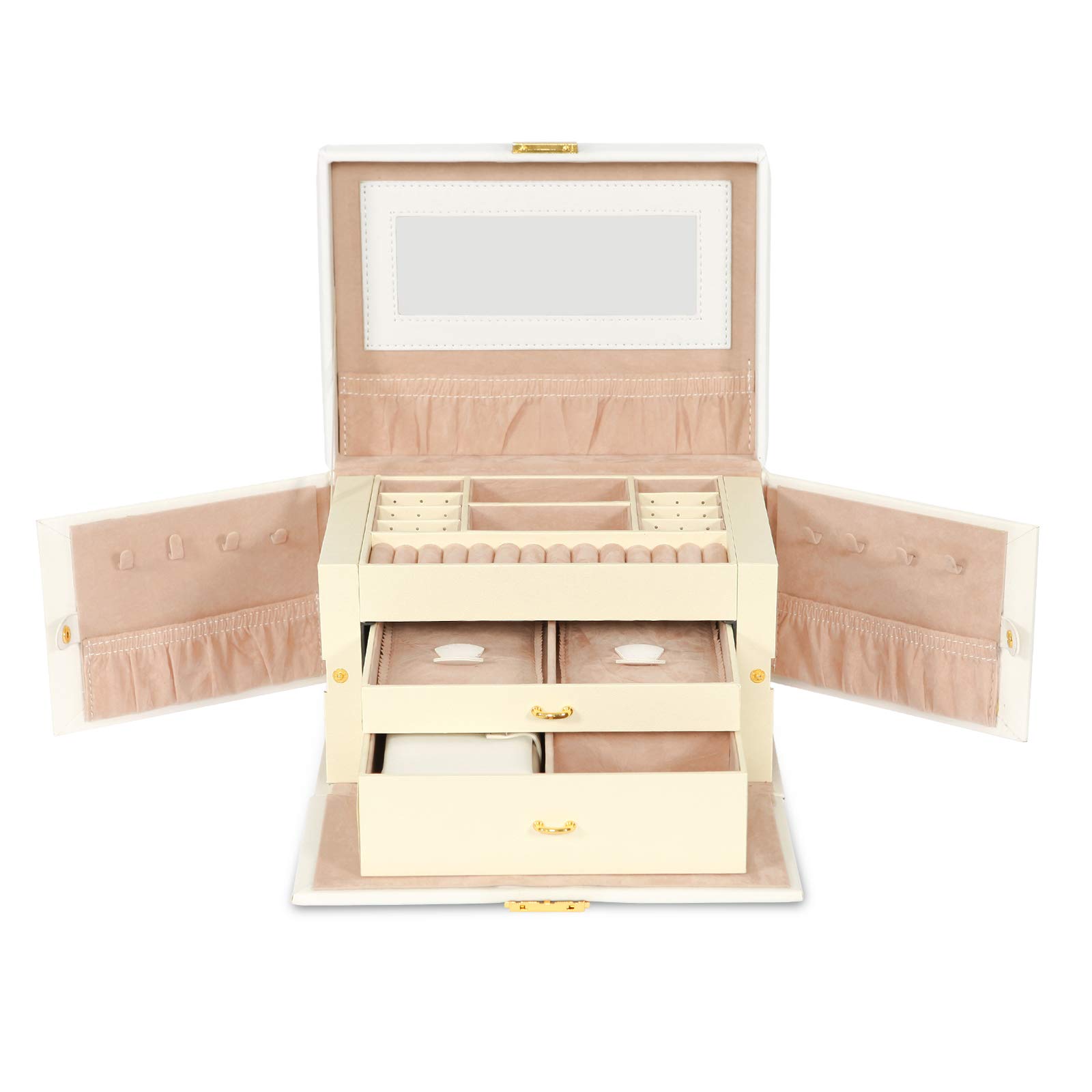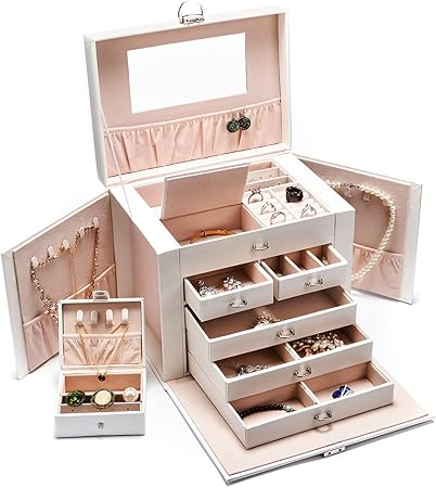 Asvert Boite A Bijoux En Cuir Pu Coffret Coffre A Bijoux 5 Tiroirs Avec Cle Miroir Boite De Voyage Maquillage Femme Filles Rangement Bijoux Pour Bagues Boucles D Oreilles Colliers Bonne Cadeau Blanc Amazon Fr