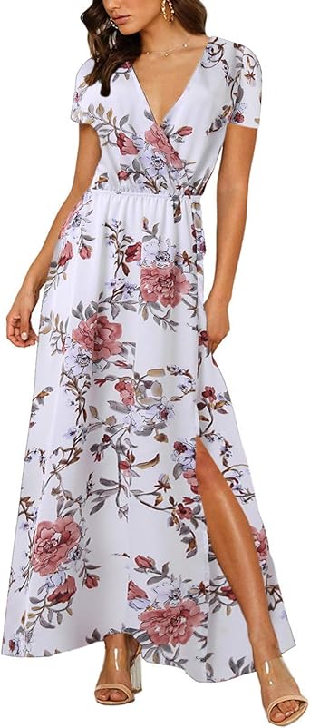 Robe Longue Boho Imprime A Fleurs Drape Decollete Plongeant Sans Manches Ete Blanche Robe Longue Robes